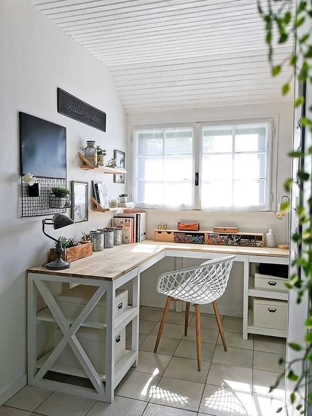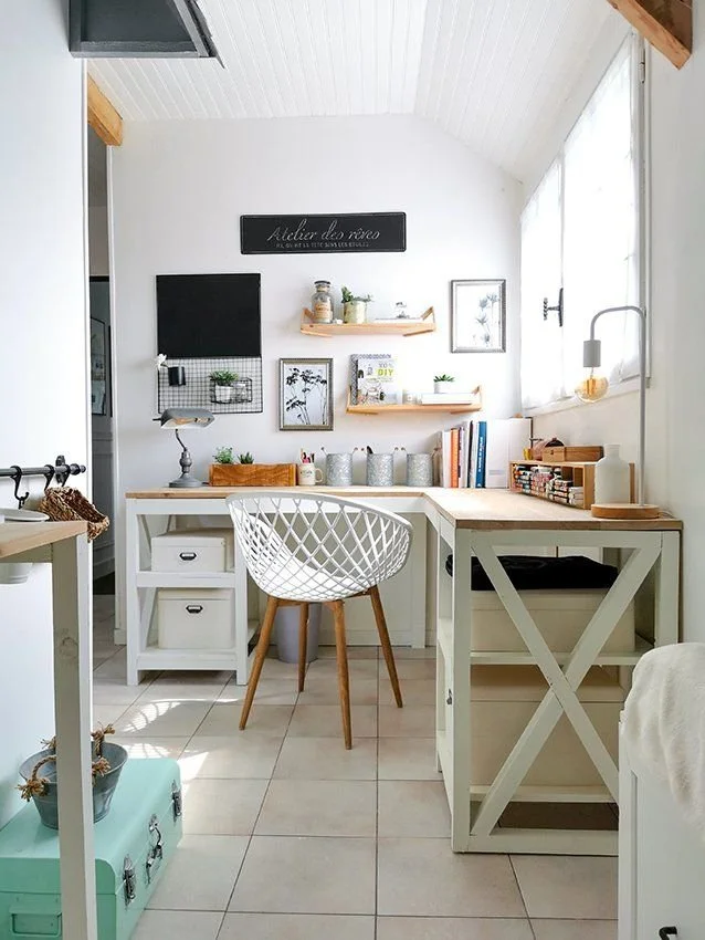 Une large planche en bois et des étagères du même matériau peuvent transformer ce petit coin en un bureau à domicile parfait. Peignez le mur du fond dans l'une de vos couleurs préférées pour mettre ce coin en valeur ou restez sobre comme dans cet exemple : https://www.lejournaldelamaison.fr/wp-content/uploads/sites/8/2022/01/optimisation-recoins.jpg