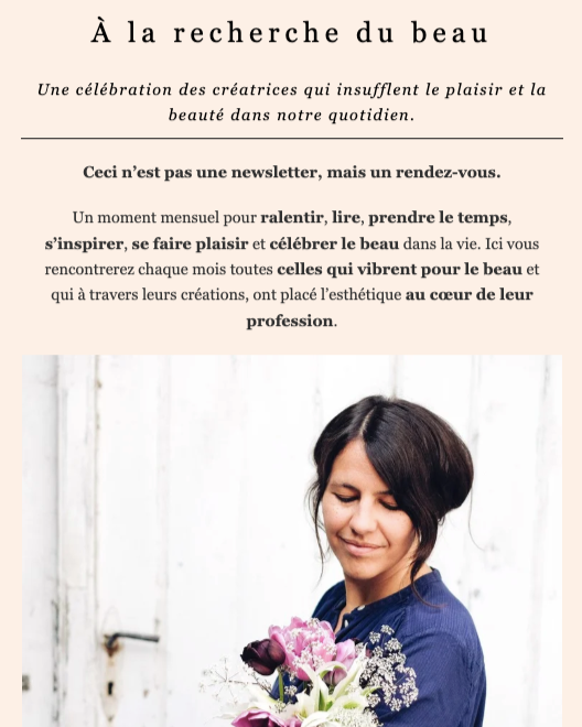 Si vous croyez à la puissance du beau, rejoignez la communauté en quête d'esthétisme au quotidien. Chaque mois, je partagerai avec vous des histoires de femmes qui m'inspirent et pour lesquelles le beau est aussi important que pour moi. Ensemble, cultivons le beau dans nos vies !